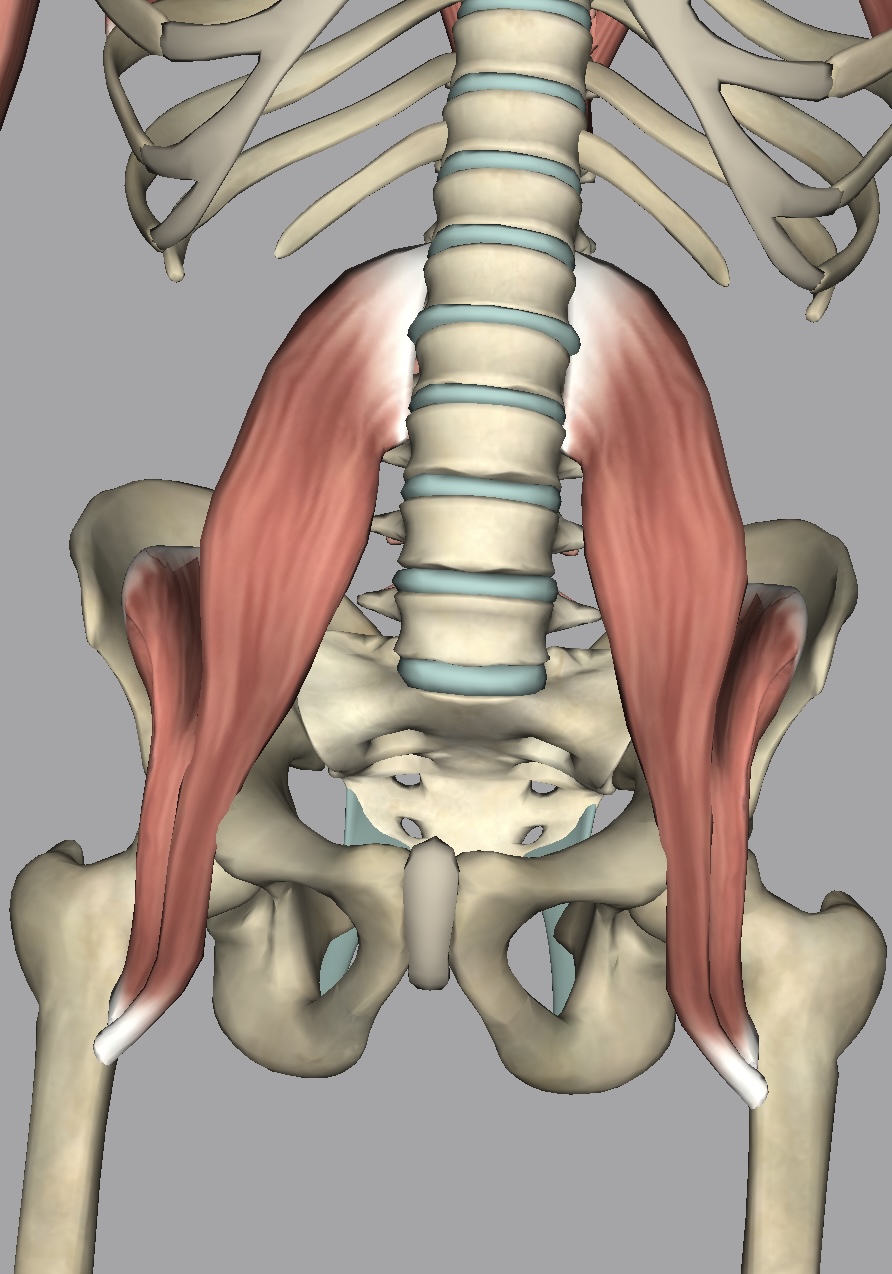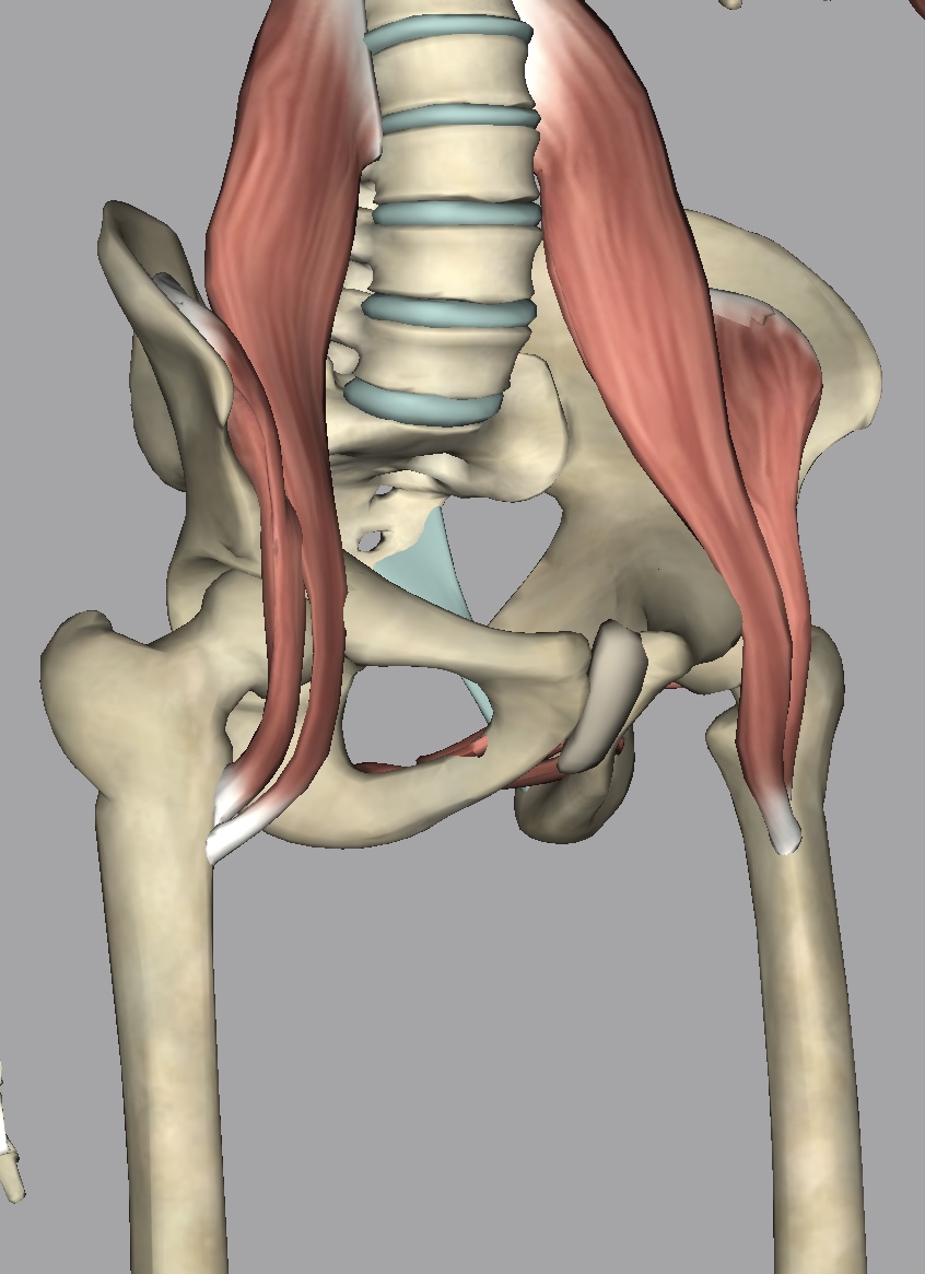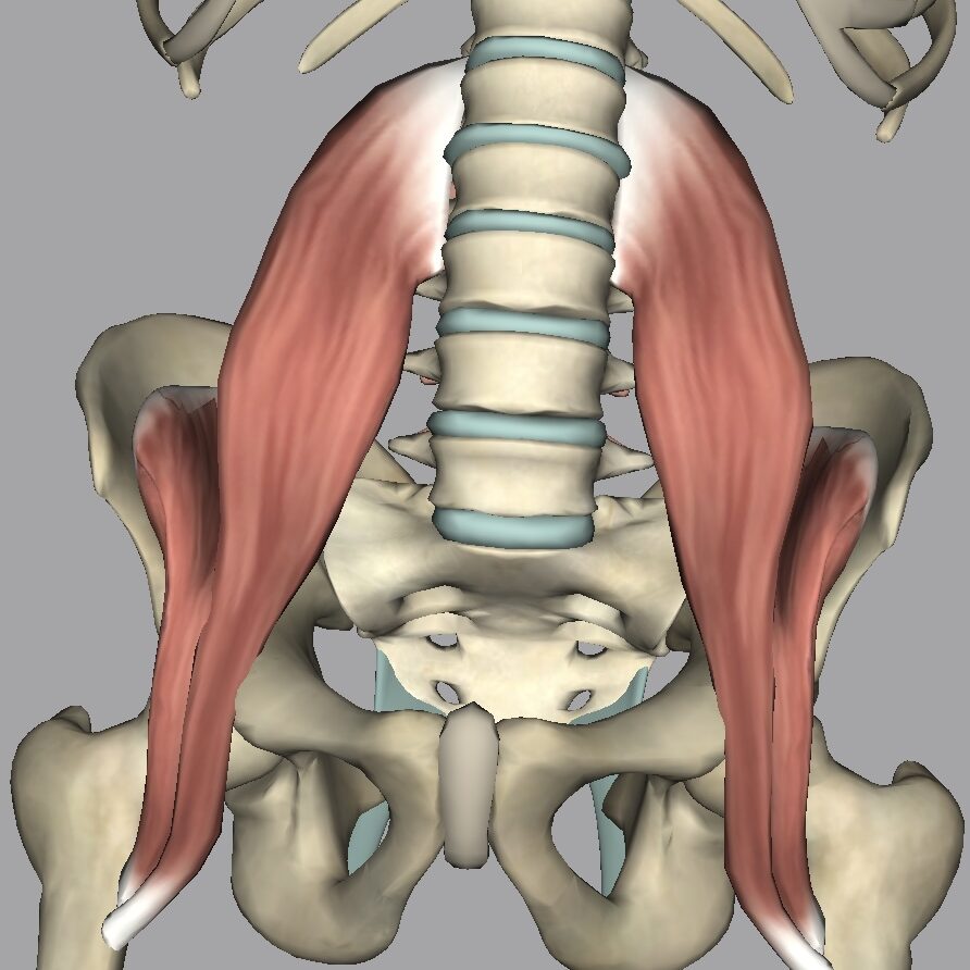 Psoas major začíná na každém z bederních obratlů a spojuje se v jeden silný sval, na který se připojuje Illiacus, který je uchycen na vnitřní straně pánve.
