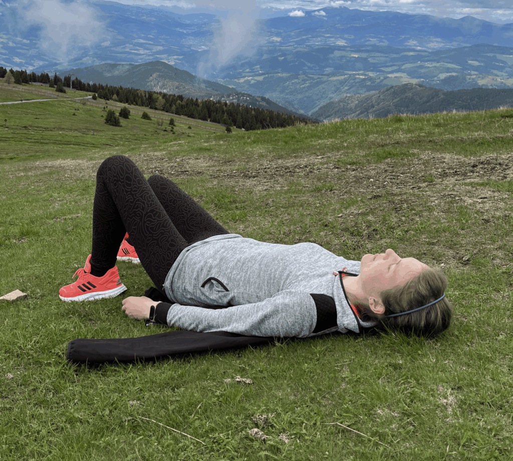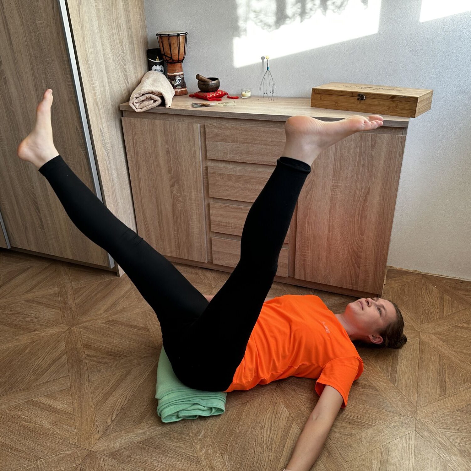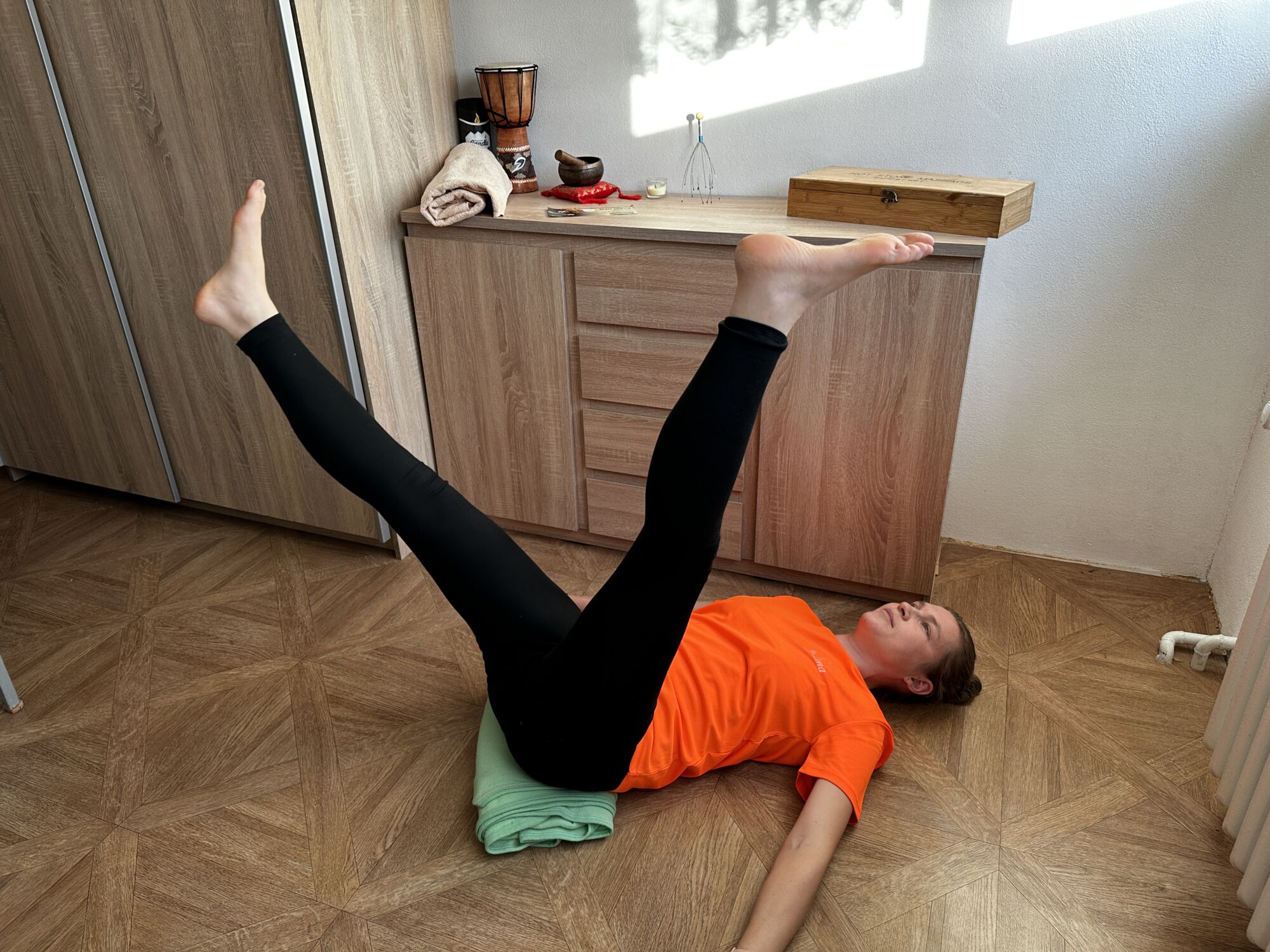 • Lehnete na záda, pod zadek složíte deku (snáze se vám zvednou nohy a nebudou vás omezovat zkrácené svaly na zadní straně stehna)