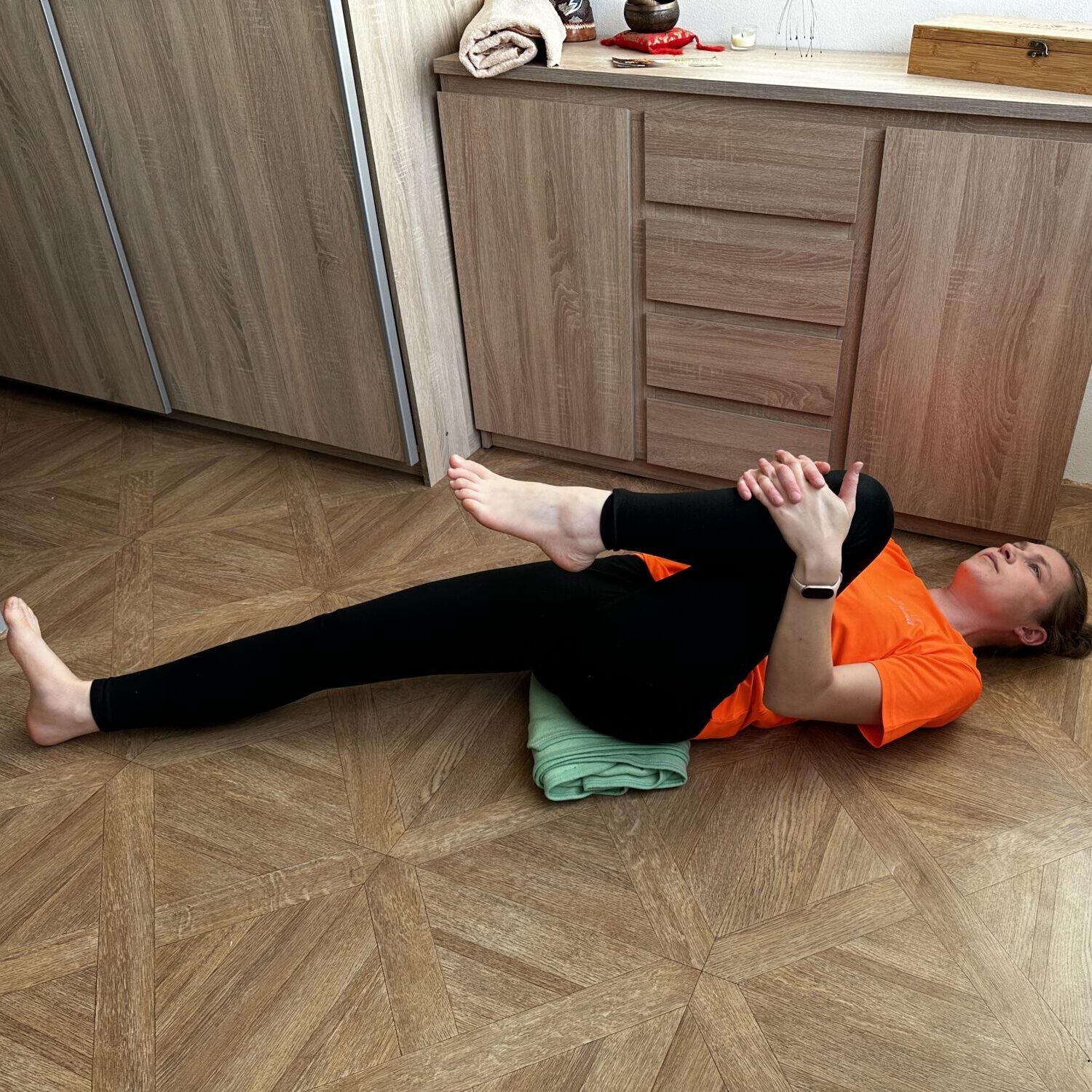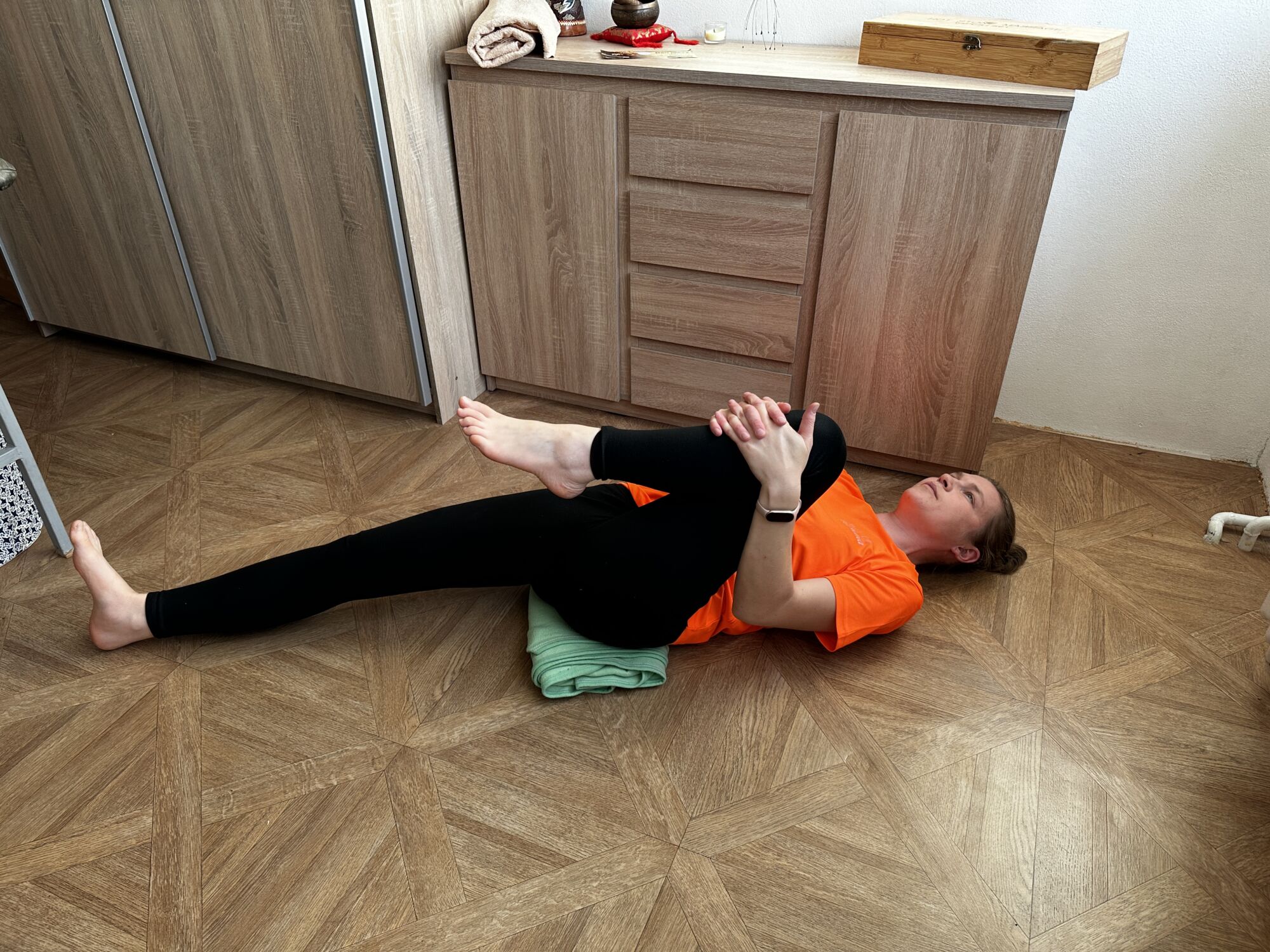 1. Lehnete si na záda, hýždě podložíte polštářkem, nebo složenou dekou