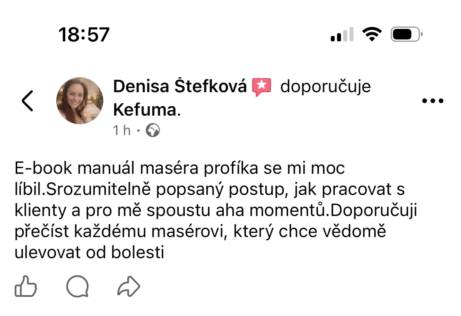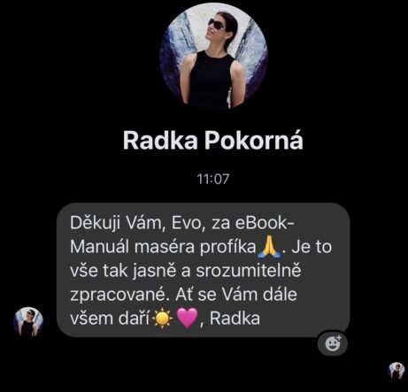E - book je parádní. Od včera si pročítám každý odstavec a nasávám nové informace. Ze všech dosavadních kurzů co mám za sebou a tištěných skript, jsi pro mě zatím nejlepší lektorka a masérka.